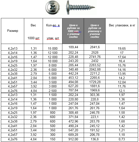 - От вида упаковки У нас в продаже присутствуют три вида упаковки на каждое изделие: Маленькая (блистерная) упаковка, Средняя (картонная с окошком) упаковка, Большая (промышленная, картонная) упаковка. Чем больше упаковка, тем меньше цена за единицу изделия (штука / кг.). Поэтому выгоднее приобретать саморезы в больших промышленных, заводских фасовках.