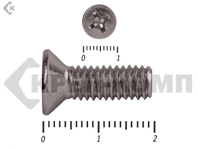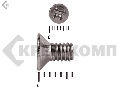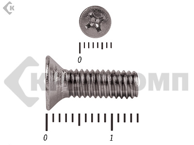 Винт DIN 965 из нержавейки с потайной головкой с крестообразным шлицем и полной резьбой. Данные винты выполнены из нержавеющей стали, благодаря чему, могут использоваться и в агрессивных средах, с повышенной влажностью. Винты нержавеющие DIN 965 используются в строительстве, машиностроении, промышленных и производственных отраслях совместно с шайбами, гайками соответствующих размеров.